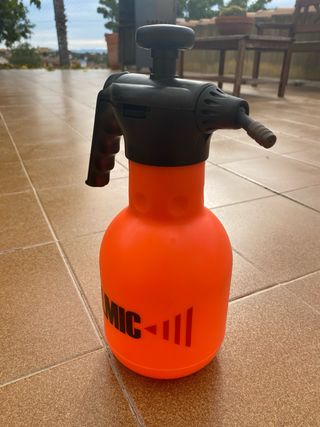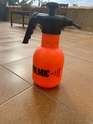 Botella para fumigar de color naranja brillante, con asa y pulverizador. - Marca: PULMIC - Material: Plástico resistente - Capacidad: (No especificada) - Color: Naranja