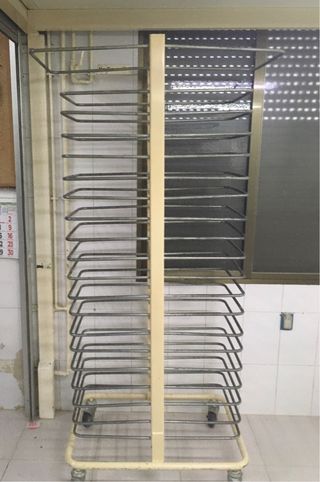 Bandejero metálico con ruedas, diseñado para organizar y almacenar latas. - Capacidad para 42 latas.medidas de la lata 40por 60 cm - Estructura de metal resistente. - Base con ruedas para fácil movilidad.