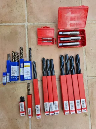 Conjunto de brocas de acero rápido (HSSE) , brocas acero rapido,machos de roscar metal, fresas, expulsor fresas huecas...., algunos elementos nuevos y otros de poco uso, de la marca IZAR y HEPYC
