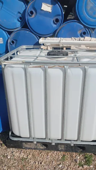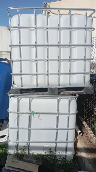 Se venden bidones IBC de 1000 litros. Con grifos rotos - Estructura metálica. - Contenedor de plástico blanco.