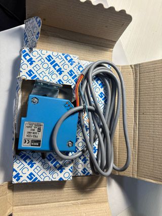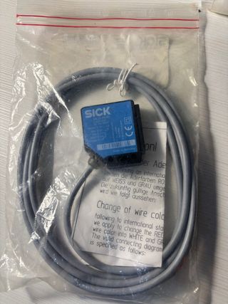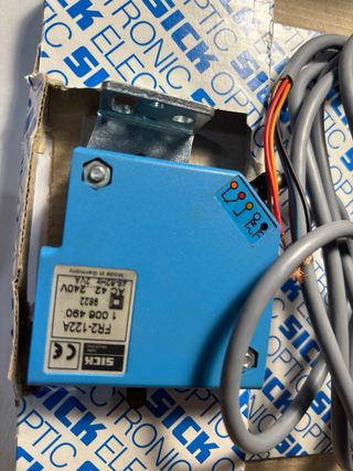 Sensor óptico SICK modelo FR2-122A. - Carcasa de color azul. - Incluye cable de conexión. - Fabricado en Alemania.