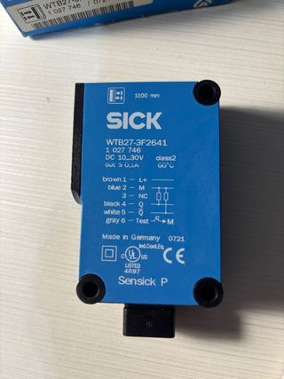 Sensor SICK WTB27-3F2641 con un rango de detección de 1100 mm. - Modelo: WTB27-3F2641 - Voltaje: DC 10-30V - Corriente de salida: Out ≤ 0,1A - Temperatura de operación: 60°C - Fabricado en Alemania