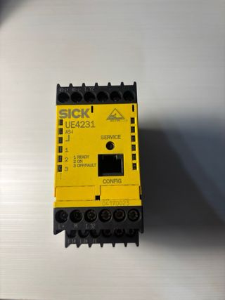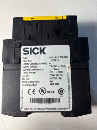 Módulo de seguridad SICK UE4231-22CE010. - Tipo: UE4231-22CE010 - Número de material: 1025815 - Categoría de seguridad (EN954): 4 - Tensión de alimentación: 24V DC +/-15% - Consumo de corriente: <150mA - Rango de temperatura: -20.. +60°C - AC-15: 230V AC/3A - DC-13: 24V DC/1A - Uimp (EN50178): 4kV - Número de serie: 0417 0023 - Fabricado en Alemania - Instrucciones de operación: 8010761/0881