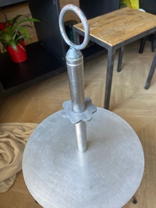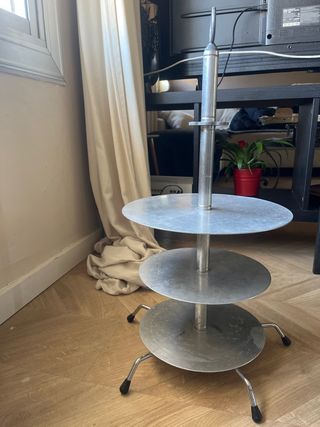 Expositor metálico resistente de tres niveles. - Material: Metal. - Diseño de 3 pisos. - Base con patas.