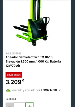 Apilador semieléctrico marca Pramac, modelo TX 10/16. - Elevación máxima de 1.600 mm. - Capacidad de carga de 1.000 Kg. - Batería de 12V/110Ah. - En muy buen estado.