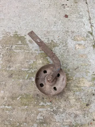 Rueda metálica antigua, probablemente de un apero agrícola. - Material: Metal. - Color: Oxidado/marrón. - Diseño: Rueda con 4 agujeros.