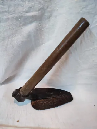 Herramienta agrícola antigua de hierro con mango de madera. - Hoja de hierro con signos de uso y óxido. - Mango de madera. - Diseño clásico de hazada.