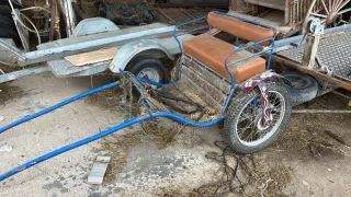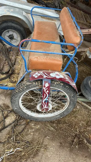 Carro de arrastre para poni o burro, con estructura de metal azul y asientos de cuero marrón. - Ruedas de radios. - Decoración floral en guardabarros. - Incluye barra de tiro. Algo negociable
