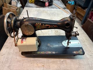 Máquina de coser antigua con un diseño decorativo en negro y detalles dorados y de colores. - Volante metálico. - Motor eléctrico adjunto. - Base metálica con adornos.