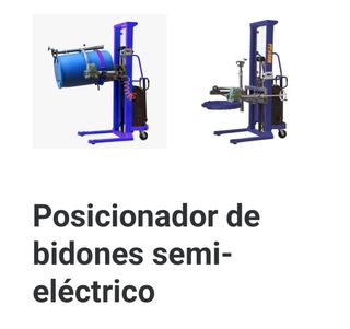 Carretilla elevadora semi-eléctrica diseñada para manipular bidones. - Permite elevar y voltear bidones de forma eficiente. - Estructura robusta de color azul. - Sistema semi-eléctrico para facilitar las operaciones.