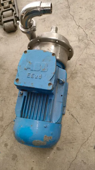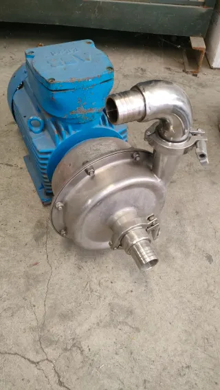 Bomba de agua industrial con motor eléctrico y conexiones de acero inoxidable. - Motor eléctrico azul. - Cuerpo de la bomba de acero inoxidable. - Conexiones de entrada y salida de acero inoxidable con abrazaderas.