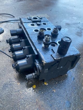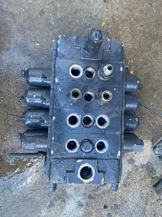 Se vende distribuidor hidráulico. - Múltiples conexiones para mangueras. - Componentes de metal y plástico negro.