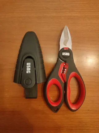 Tijeras de electricista profesionales de la marca USAG, modelo 207E. Incluyen funda protectora. -Corte hasta 50mm -Pelacables 1,5 2,5 4 -Crimpa terminales - Mango ergonómico con detalles en rojo. - Hoja de acero. - Funda negra con clip.