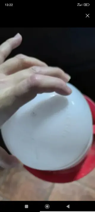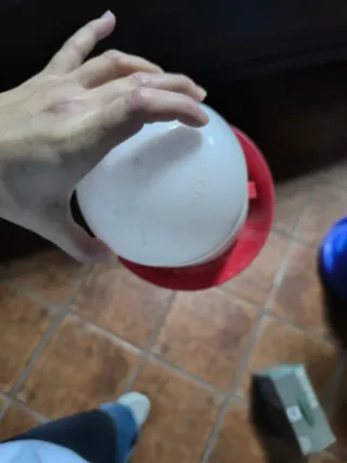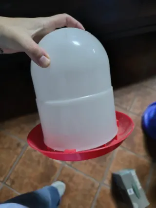 Comedero para gallinas de plástico blanco y base roja. - Diseño de cúpula. - Base ancha para mayor estabilidad. - Venta por cierre de tienda. Todo lo recaudado irá para la protectora Amor Animal
