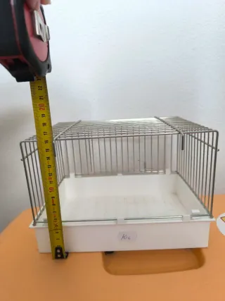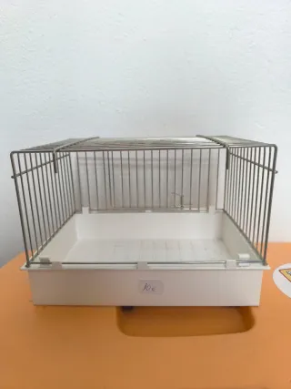 Jaula metálica con base de plástico blanco. - Estructura de alambre. - Base de plástico. - Ideal para mascotas pequeñas.