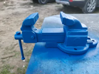 Tornillo de banco de la marca Arno, recién pintado en color azul. - Base robusta con orificios para fijación. - Mordazas de metal. - Palanca para ajuste.
