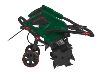 Motoazada eléctrica de color verde, ideal para trabajar la tierra de tu jardín o huerto. - Diseño compacto y manejable. - Empuñaduras ergonómicas para mayor comodidad. - Ruedas para facilitar el transporte.