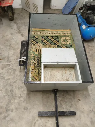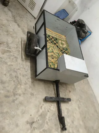 Remolque para acoplar a una motoazada. Medidas a partir de la foto 7. - Estructura metálica. - Lleva una alfombra para llevar las fresas y lo que sea sin que haga ruido en los baches. - Tiene una caja adicional en la parte frontal que sirve de asiento y para llevar herremienta basica o algo pequeño. - El mastil es plegable para que ocupe menos sitio al guardarlo.