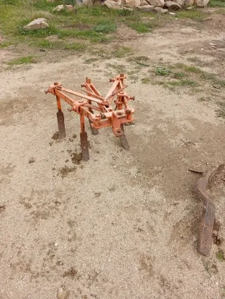 Arado de enganche para motocultor. Diseñado para trabajos agrícolas. - Estructura metálica naranja. - Tres puntas de arado.