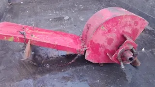 Rotavator de color rojo, diseñado para espárragos. - Estructura metálica. - Cadena de sujeción. - Protector curvo. -rotavator para hacer los socavones del espárrago para motocultor o tractor pequeño.