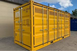 Contenedor de almacenamiento de color amarillo brillante. - Modelo: ATSU 220496 B - Número de serie: 2562 - Puertas de acceso múltiples con cierres de seguridad.