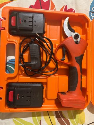 Tijera de podar eléctrica con dos baterías y cargador. - Incluye dos baterías recargables. - Cargador de batería. - Maletín de transporte.