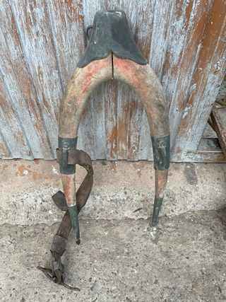 Orcate original antiguo, utilizado tradicionalmente para animales de tiro como mulas. Está fabricado en madera maciza con refuerzos metálicos y conserva su correa de cuero original. Pieza única con un desgaste natural precioso que le da un auténtico carácter rural. ✔ Madera envejecida con pátina original ✔ Herrajes metálicos antiguos ✔ Correa de cuero incluida ✔ Ideal para decoración rústica, casas de campo, restaurantes, bodegas o coleccionistas. Estado: usado y con señales del paso del tiempo, totalmente acorde a una pieza antigua de campo.