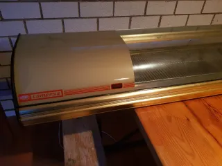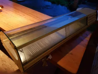 Vitrina de bar refrigerada de la marca Comersa. Su diseño alargado y elegante la hace ideal para cualquier establecimiento. Metro y medio de largo Funciona perfectamente. Más información preguntar - Color beige y detalles en dorado. - Frontal con cristal y rejilla interior.