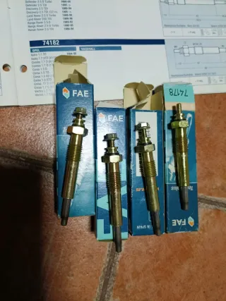 Juego de 4 calentadores FAE, referencia 74182. Producto nuevo procedente de cierre de tienda de recambios. Falta uno de los tornillos, se puede utilizar cualquier otro. - Compatibles con modelos Opel y Vauxhall. - Diseñados para motores Isuzu. - Fabricados en España. Opel Astra 1.7, Corsa A, kadett E 1.5 y 1.7 Monterrey 3.1, Vectra 1.7 Isuzu Midi, Gémini, Faster