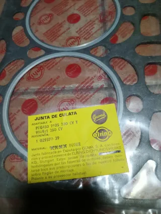 Junta de culata para motores Pegaso. - Compatible con modelos 9105 de 200 CV y 9109 de 260 CV. - Referencia: 1 029370 39. - Fabricada en España. Producto nuevo procedente de cierre de taller. Desconozco estado de la misma aunque se conserva en su envoltorio original.