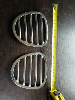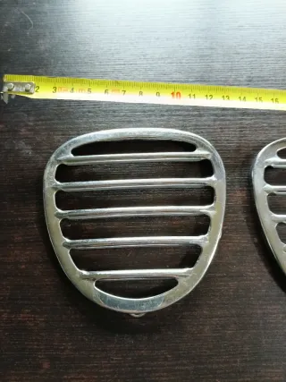 Juego de dos parrillas antiguas cromadas para coche clásico. Son piezas decorativas con un diseño de barras. Desconozco modelo, tienen algún síntoma del mal almacenamiento pero son nuevas de antiguo taller. - Medidas aproximadas: 10.5 x 10.5 cm. - Material: Metal cromado.