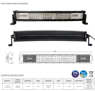 Barra de LED "curva" de 55 centímetros ,sin los soportes laterales. 71w y 5500 Lumenes Es una barra robusta y resistente, ideal para cualquier vehículo. CE. R10.Carcasa de aluminio. IP67. Haz de inundación - Tfn: 63029157 - 12-24v - Incluye tornillos para montaje. - Cable de 0.3 m.