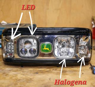 Faros de trabajo LED para el capot de tractores John Deere. - Compatibles con series 8020, 8030 y 8R (2009-2011) - Diseño de alta intensidad lumínica. 4 faros (2+2) --Exteriores 8020 e Interiores 8030. Conector H4.65w, 13 leds Cree de 5w. 5200 lumenes efectivos cada faro. También aptos para Cosechadoras CaseIh 7000,8000,9000. Reemplazan la ref: RE260102 --Exteriores 8030 e Interiores 8020 (y central "el que lo lleve montado"). 39 w, 13 leds Cree de 3w. 3200 lumenes efectivos cada faro. Reemplazan las ref: RE271574,RE180613 y RE271573 -- Color blanco frio 6000K. Utilizan soporte y cableado original, haz de inundación.