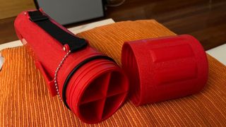Porta electrodos de soldadura de la marca Nuvo, completamente nuevo. - Color rojo. - Diseño cilíndrico. - Tapa con cierre de rosca. - Correa de sujeción. - Compartimentos interiores.