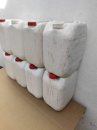 Ocho bidones de plástico de 20 litros cada uno. Se pueden enviar a través de wallapop. Precio por los 8 Tapón anti gases no pierde líquido. Están usados, con algunas marcas de suciedad. Pueden contener posos en su interior, se pueden limpiar bien. Ideales para almacenar líquidos. - Capacidad: 20 litros cada uno - Material: Plástico - Color: Blanco con tapas rojas - Cantidad: 8 unidades