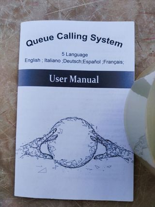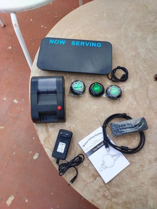 Sistema de llamadas para gestionar colas, incluye pantalla NOW SERVING y pulsadores NEXT. - Pantalla NOW SERVING. - Tres pulsadores NEXT. - Receptor con cable. - Manual de usuario.