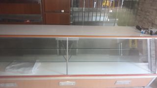 Mostrador. estantería de metal, estantería de madera y vitrina expositora con posibilidad de frío.