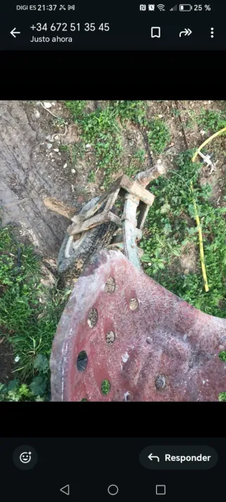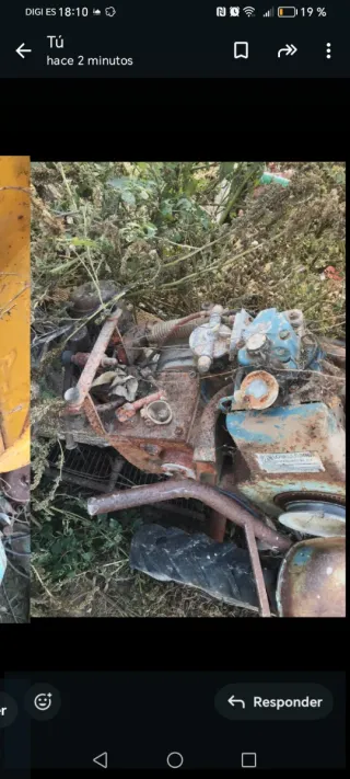 Conjunto de piezas de maquinaria agrícola, algunas con óxido. - Ruedas de goma. - Partes metálicas de color azul y naranja. - Componentes de color verde. Pregunta por piezas Manillar Motor Cajacambio Piñones Pistin Cilindro Plato I dico Embrague