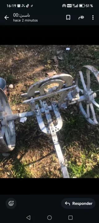 Apero para mula mecánica. Se encuentra en buen estado. Ideal si sales a dar paseos o engancharlo una apero atras - Pieza de metal con varios orificios. - Estructura de soporte de madera y metal.