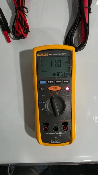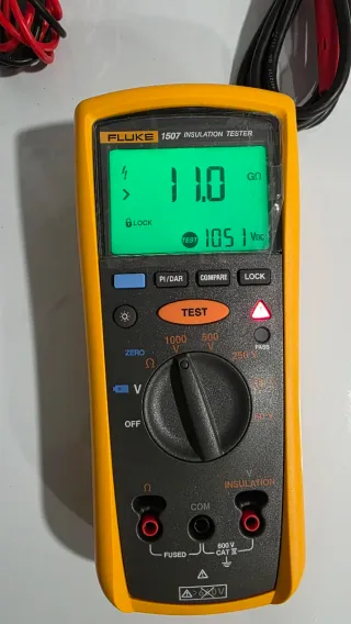 Medidor de aislamiento Fluke 1507 en color amarillo. Todavía lleva el plástico en la pantalla,usado unas 3 veces,siempre guardado y protegido,está impoluto,como si lo estrenaras tú, - Pantalla digital. - Botones de función PI/DAR y COMPARE. - Indicador luminoso PASS. Un medidor de aislamiento completo y muy preciso,vale tanto para vivienda como para industria,motores,líneas,bobinados,transformadores,no puede faltar en el cajón o en la caja de herramientas.