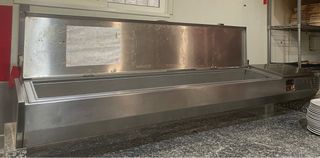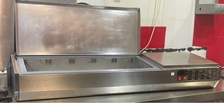 Precio por unidad Vitrina refrigerada de acero inoxidable, ideal para mantener frescos los ingredientes. - Diseño alargado y funcional. - Tapa abatible de acero. - Superficie de trabajo integrada.