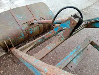 Pala de carga para tractor. Se encuentra en buen estado, con la pintura azul desgastada por el uso y el paso del tiempo, mostrando óxido en varias partes. - Estructura metálica robusta. - Cilindro hidráulico visible. - Fácil acoplacion al ser por cañoneras. - Estaba montada en un Super 55 pero se puede colocar en más modelos.