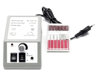 Set de torno para manicura y pedicura, ideal para uso profesional o doméstico. Incluye el torno principal, un soporte y un set de fresas. - Tensión de entrada: 100-240V AC. - Tensión de salida: 0-12V DC. - Potencia máxima: 12W. - Incluye 6 fresas de diamante y 6 lijas cilíndricas.