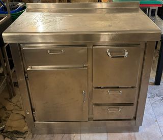 Mueble de acero inoxidable con superficie de trabajo y almacenamiento. - Diseño robusto y duradero. - Cajones y compartimento con puerta. - Acabado metálico.