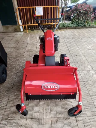 Desbrozadora Roteco TT70 en color rojo. Desbrozadora de cuchillas múltiples autopropulsada Grupo de cambio en baño de aceite de 4 velocidades: 3 A (Adelante) + 1 R (Atrás) Ancho de trabajo: 70 cm Sistema de corte: 38 cuchillas tipo Y Regulación de altura centralizada Peso: 180 kg Motor: 9.5 H.P. 270 cc Gasolina 4T