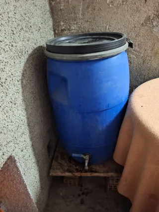 Bidón de plástico oscuro, ideal para almacenamiento. - Tapa negra con cierre de seguridad. - Grifo metálico en la parte inferior.
