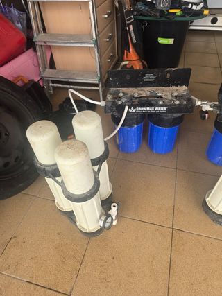 Se venden dos sistemas de ósmosis inversa. Uno incluye tres filtros azules Growmax Water, y el otro, tres filtros blancos. Ambos parecen usados, pero están en buenas condiciones. - Sistema 1: 3 filtros azules Growmax Water. - Sistema 2: 3 filtros blancos.