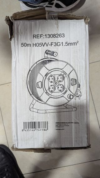 Enrollador con 4 tomas shuko y 25 m de cable HO5VV-F3G1.5. Clavija con toma de tierra 250 V. 16 A. Protección térmica DSS. Tambor de Ø 230 mm. Para uso en medios secos. Se dispone de varias unidades Situado en Cervelló (Barcelona)