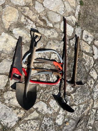 Conjunto de herramientas agrícolas variadas para trabajos en el campo o jardín. - Pala con mango de madera y agarre ergonómico. - Serrucho de poda con hoja curva. - Serrucho de mano con mango de madera. - Azada con mango largo. - Serrucho de arco Bellota.