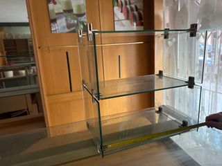 Vitrina expositora de cristal, ideal para colocar sobre un mostrador. - Estructura de cristal. - Soportes metálicos.